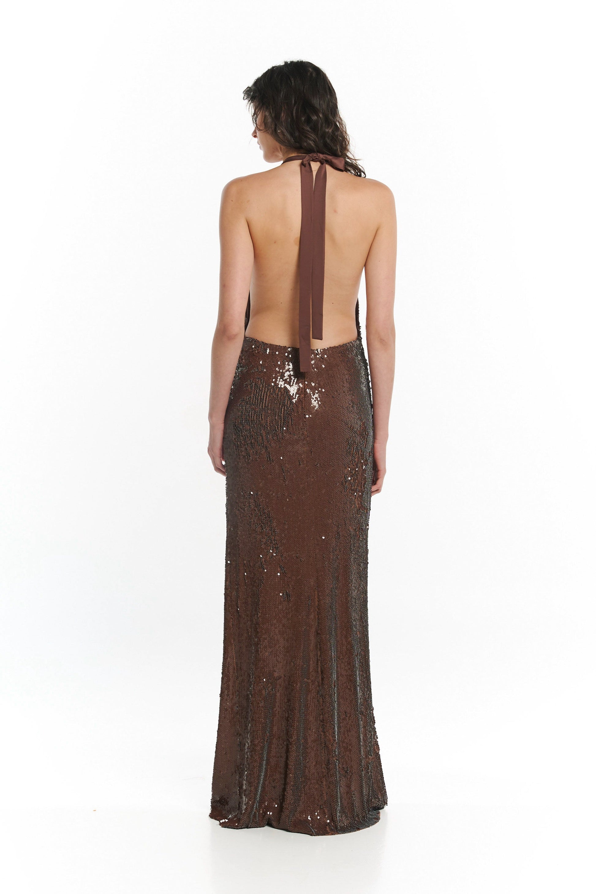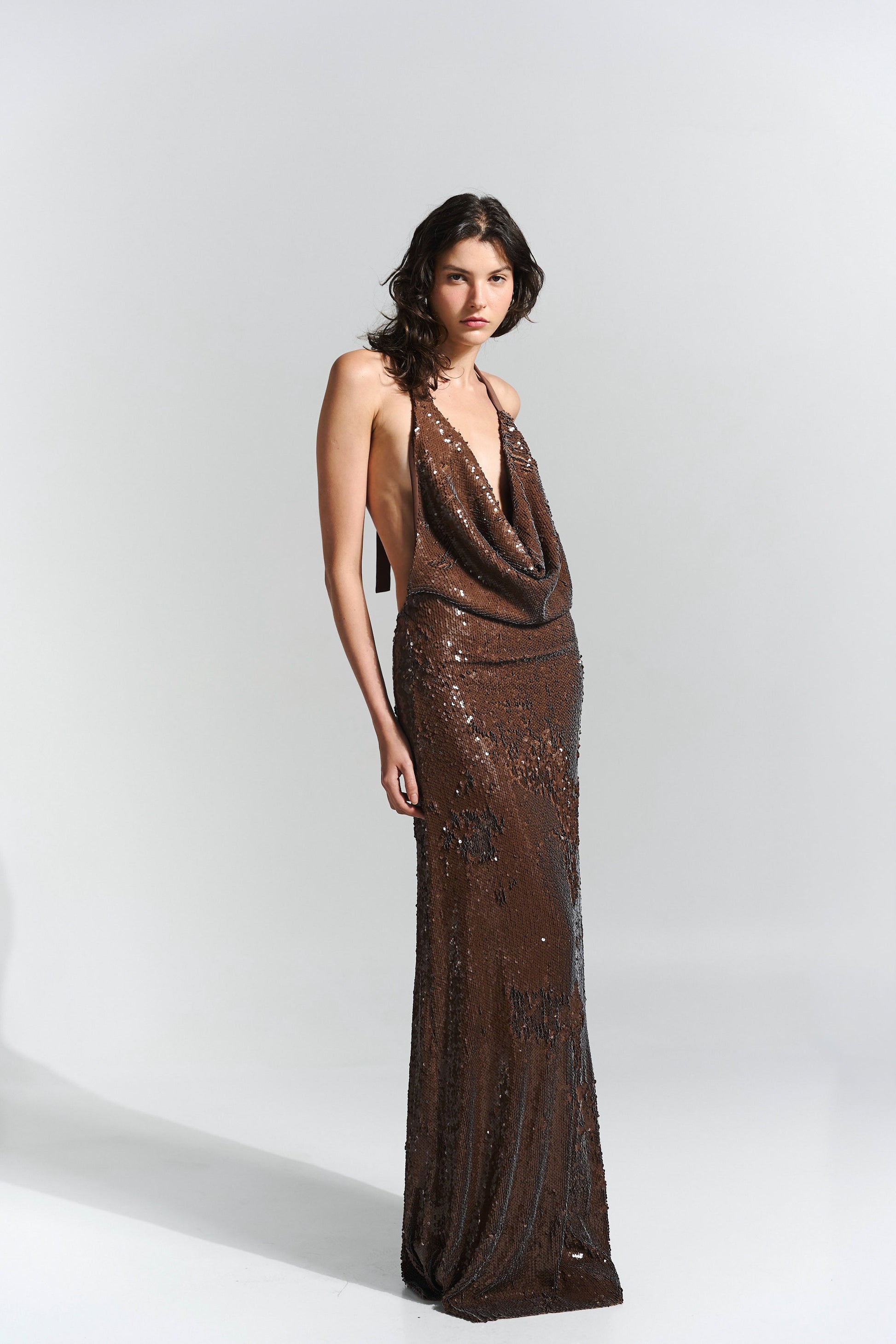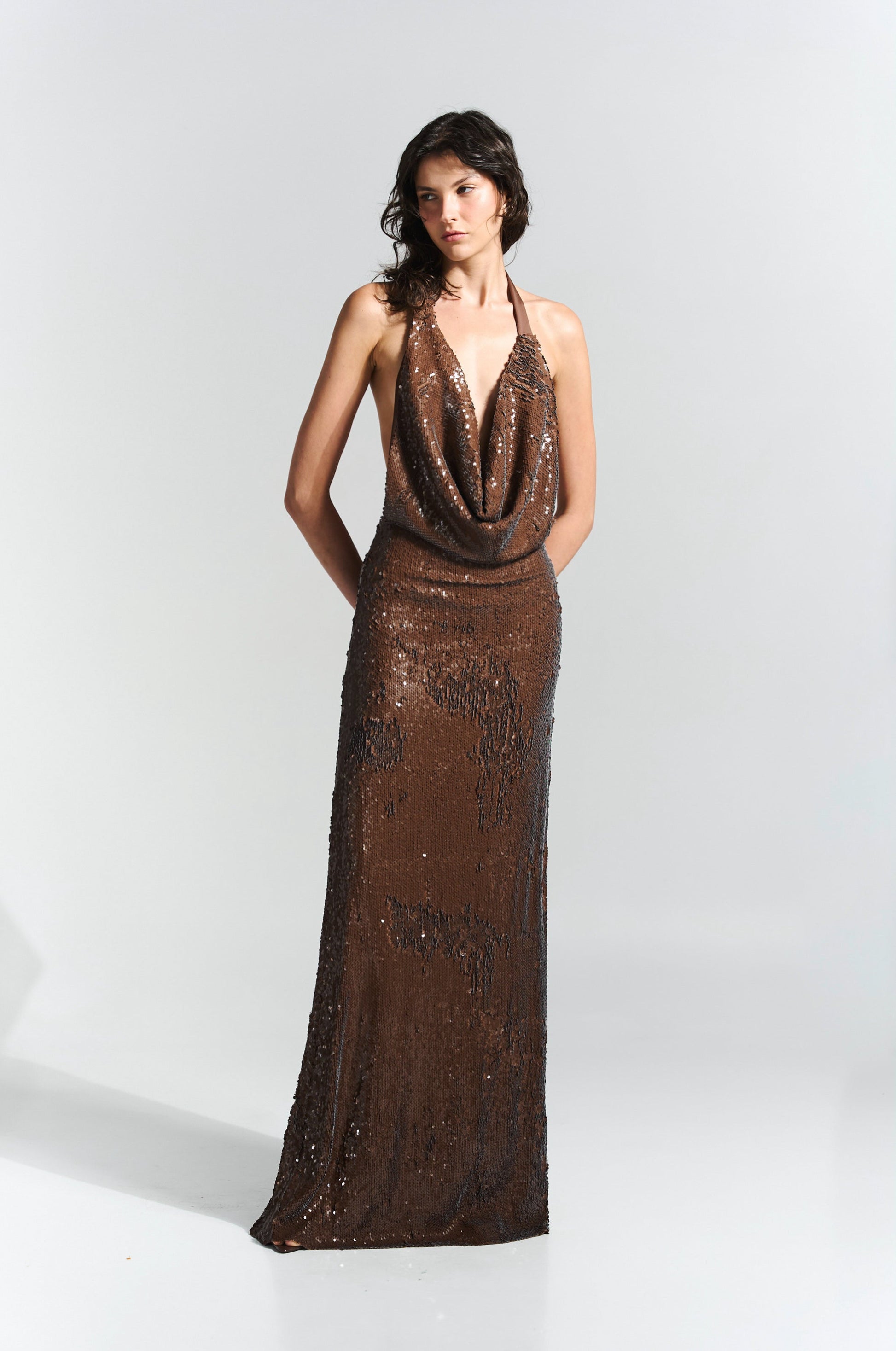 Long sequin dress with a draped neckline and open back, designed for a fluid, luminous silhouette.